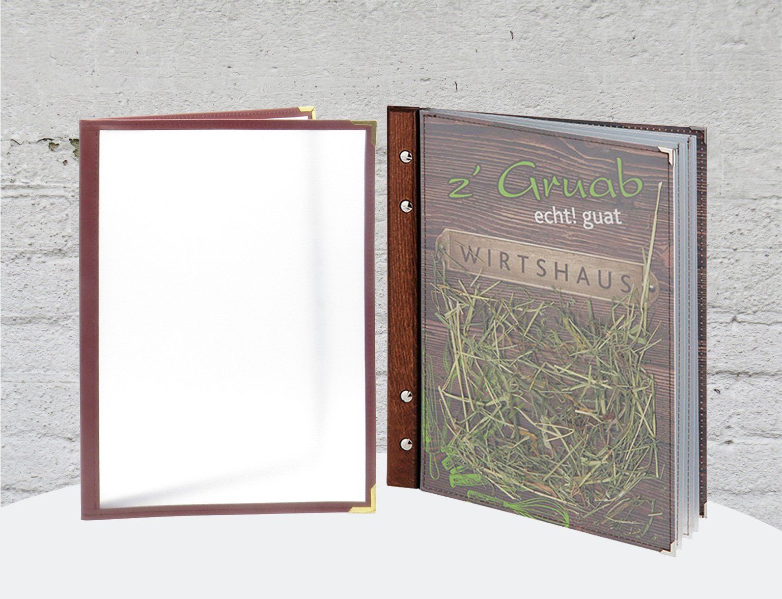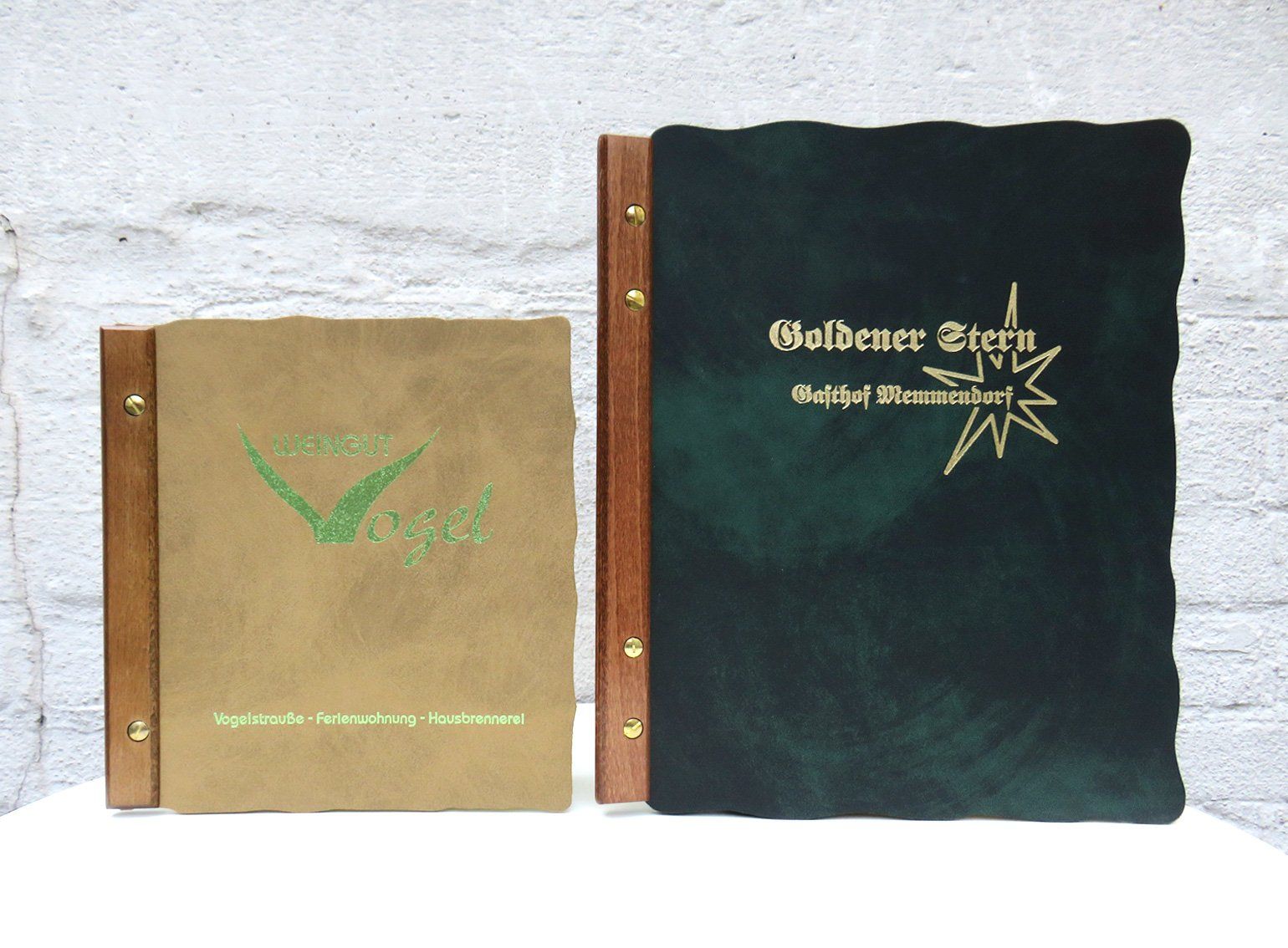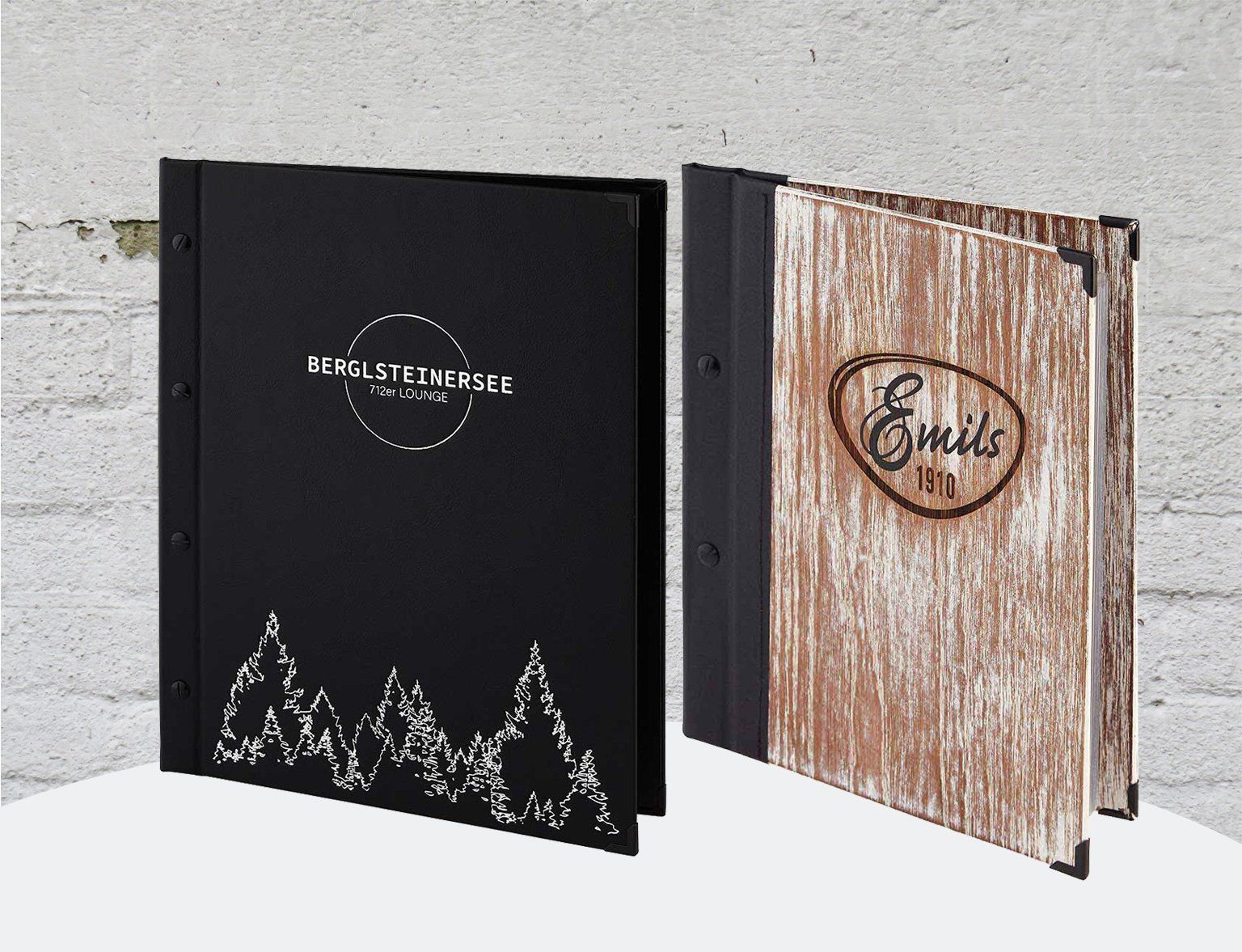 Menus with a screw cap in the materials Medici linen, soft / designer leather, woody and print