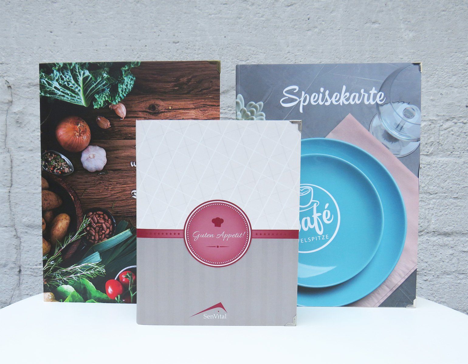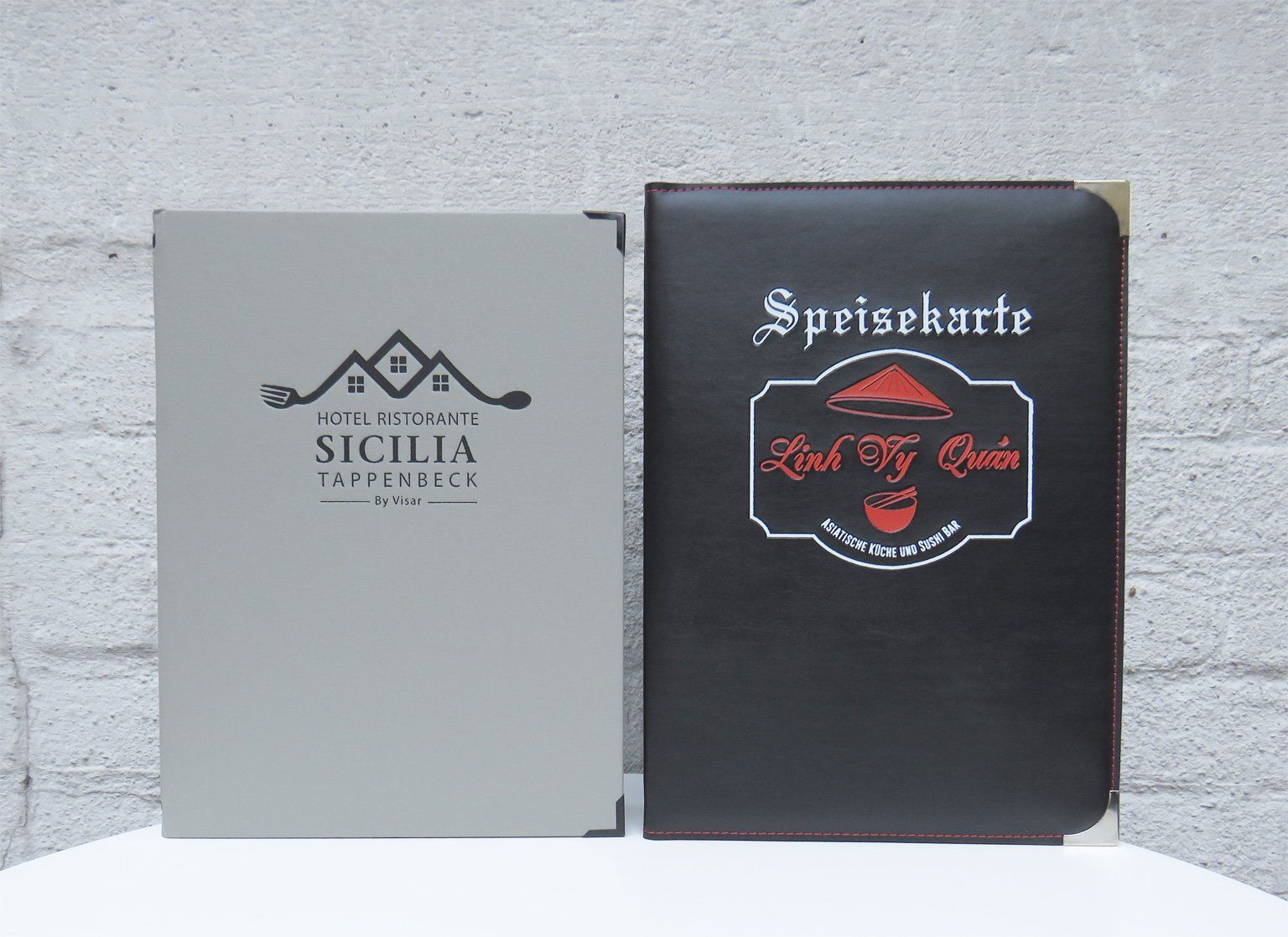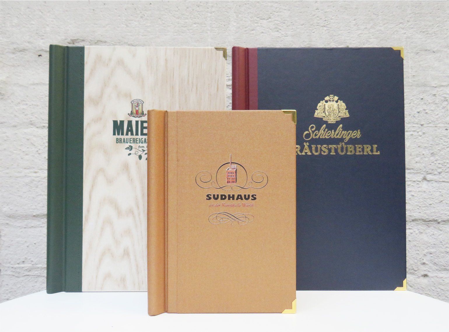 Menus with a screw cap in the materials Medici linen, soft / designer leather, woody and print